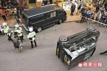 【本報訊】旺角鬧市昨午發生驚險車禍,一名空姐駕駛私家車轉入通菜街時,私家車突失控猛撞停泊路旁一輛客貨車。由於衝力強大,客貨車左車頭竟遭撞至鏟上行人路,幸未撞及途人,私家車亦餘勢未了向右翻側。駕車空姐雖僅手指輕傷,但亦嚇至花容失色。