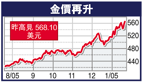 國際現貨金高位曾見每盎斯568.10美元,勁揚10.30美元(1.85%),是1981年以來最高交易價,打破剛於周二所創的564.30美元紀錄;本港時間今晨零時報561.60美元,升3.80美元。香港九九金升66元(1.30%),收報每両5135元。