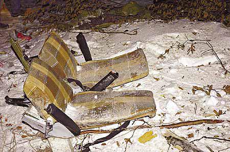 斯洛伐克一架載着四十三人的安24運輸機前天(周四)在匈牙利墜毀,造成四十二人死亡,一人奇迹生還。肇事的軍機當時剛在科索沃完成北約維和任務,正飛返斯洛伐克,但在匈牙利北部接壤斯洛伐克邊境一處山區叢林越出航道而墜毀。救援人員事後在墜機現場搜索,一具屍體躺卧在飛機殘骸之中(圖一箭嘴示),機椅散布雪地(圖二)。 美聯社