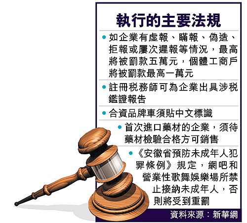 企業有虛報、瞞報、偽造、拒報或者屢次遲報等統計資料的,將處最高五萬元罰款;合資品牌汽車要貼中文標識;首次進口藥材經檢驗合格才能銷售;註冊稅務師可以為企業出具涉稅鑑證報告了……據統計,由昨日起,全國有三十部法規、規章開始實施。其中,國家級法規和地方級法規各佔十五部。