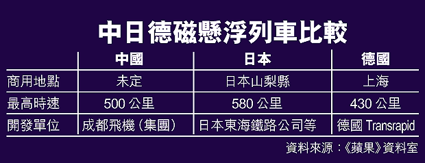 磁懸浮列車在日、德國有多年的試驗經驗,前者的磁懸浮列車在試驗期間更達到每小時五百八十公里,創世界紀錄,但仍未正式營運。六年前,日因不願向中轉讓其核心技術,痛失上海磁懸浮列車項目,讓德國在中國先拔頭籌,推出全球首個商用的磁浮列車系統。