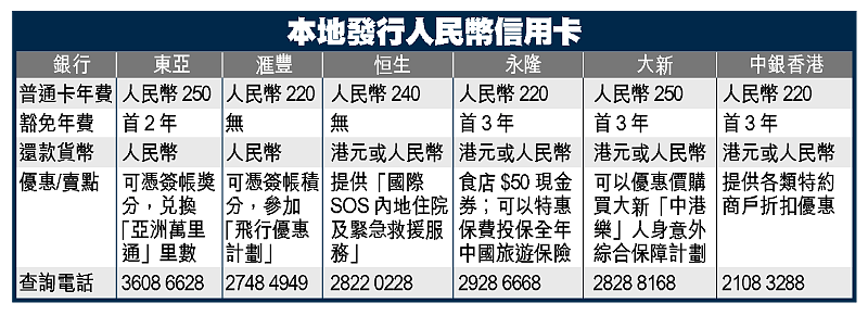 至於還款方式,一般發卡銀行容許客戶選擇以港元或人民幣「找數」,但個別銀行例如滙豐及東亞,只讓客戶以人民幣還款,並必須在該行開設人民幣儲蓄戶口,以轉帳形式繳付。