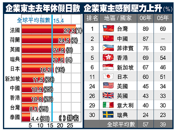 【本報訊】調查顯示,中港台的企業東主均認為今年面對的壓力會增加,並在30個國家/地區中位列前5位(見表)。有趣的是,企業東主每年放假的多寡(不包括公眾假期),與面對壓力的高低有直接關係。