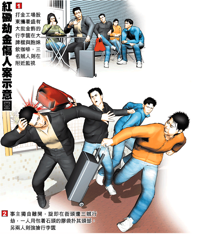 三名賊人,一人年約二十七至三十歲,瘦身材,一點七米高,直髮,身穿淺色長袖T恤,操本地話;一人年約三十歲,中等身材,平頭裝,一點六八米高,身穿黑色風褸;另一人則容貌不詳。當時,穿風褸賊人手持一個包裹着石頭的紅色背心膠袋,向事主頭部扑去,另兩人則合力強搶事主的行李篋。事主奮力反抗,被賊人用石頭向其頭部連扑十多下,當場頭破血流。