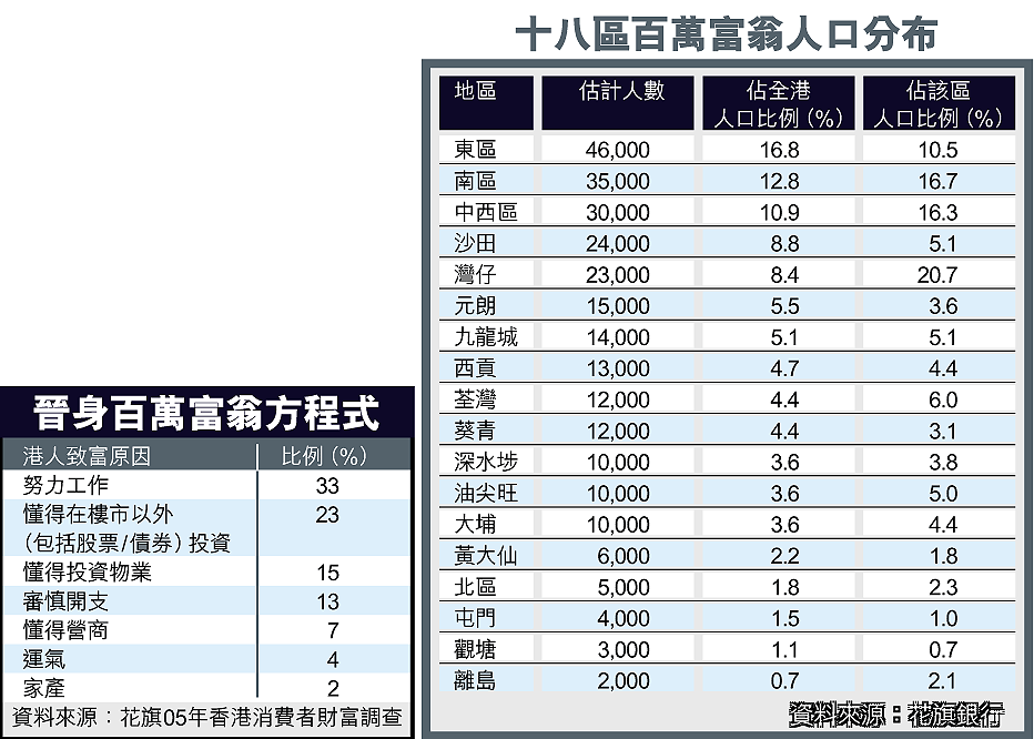 十八區內,「東區」及「離島」兩區的人口數目差距雖然只有四倍,有錢人數目竟然相差二十二倍之多。本港富翁最多集結在東區,有四萬六千人;富翁最少的地區為離島,只有二千人(見表)。