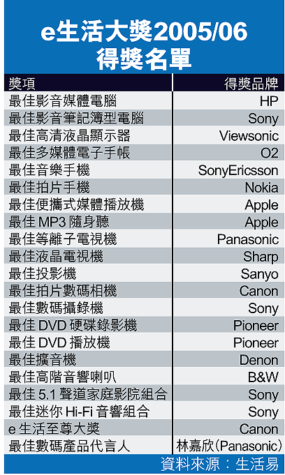 另外,生活易早前與e-zone合辦「e生活大獎2005/06」,逾一萬七千五百名市民透過生活易網站投票選舉心愛品牌,由影音界等專業人士擔任評判,結果Sony獲得四個品牌獎項,包括「最佳影音筆記簿型電腦」、「最佳數碼攝錄機」、「最佳5.1聲道家庭影院組合」及「最佳迷你Hi-Fi音響組合」;Canon以逾萬票的最高票數及專業評審的高度評價,奪得「e生活至尊大獎」。