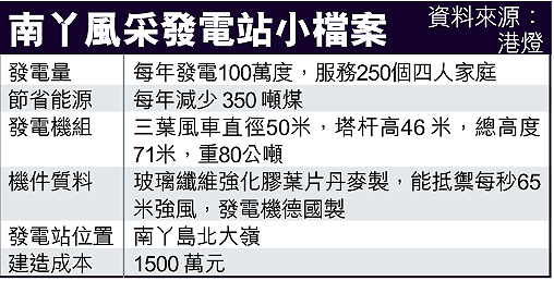 【本報訊】政府近年提倡使用再生能源,全港首個具商業規模的風力發電站昨正式啟用。由港燈斥資一千五百萬元,耗時五年籌建的「風采發電站」位於南丫島以北,預計每年產電量約一百萬度,可為二百五十個四人家庭提供電力。港燈承認風力發電仍不穩定,成本亦較燃煤高逾一倍,若大規模使用,相信港島居民將承擔更高昂電費。