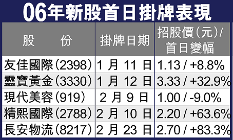 年初至今,共有5隻新股掛牌,除了現代美容(919)之外,其餘4隻首日掛牌都有不俗升幅(見表)。昨首日掛牌的創業板新股長安物流(8217)最高報5.1元,收報4.95元,較招股價2.7元,漲83.3%,難怪市場人士都預測玖龍會升上4元。