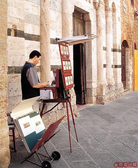 建塔樓是中世紀貴族們常做的事。除了原來的守禦用途,貴族們也以此相互誇耀權勢、財富。聖吉米爾諾的13座塔樓群是全意大利保存最好的,是它的代表建築。登上大塔,花了5歐元!可是,當我到過塔頂,還是覺得值回票價。真正的山城,真正的Tuscany,正正在我腳下。放眼盡是青葱漫綠,一個又一個丘陵野地,盡是葡萄園和小麥田。包圍着這個山城的,皆是紅色瓦頂的意式磚屋,一塊蓋一塊,一片挨一片。滿目都是用顏色拼湊出來的拼圖,一塊黃色,一塊綠色,一塊橙色,一塊青色。當然,還有那功不可沒的藍天。托斯卡尼的天空彷彿特別低,天連地,地連天,好像只要跑到綠野上,就可以觸及蔚藍天幕。終於,我才明白,SunInTuscany的確與別不同。