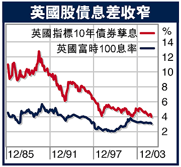 隨着英國息口看似已見頂,持有現金的吸引力開始下降。由於機構投資者積極買入債券以配合債務年期,加上亞洲國家把經常賬盈餘用來買入西方國家的證券,以致債券的孳息被拖低,此情況以長債尤甚。如附圖顯示,股債之間的息差正接近歷史低位。鑑於股票的升值潛力較大,投資者傾向捨債取股,亦是可以理解的。