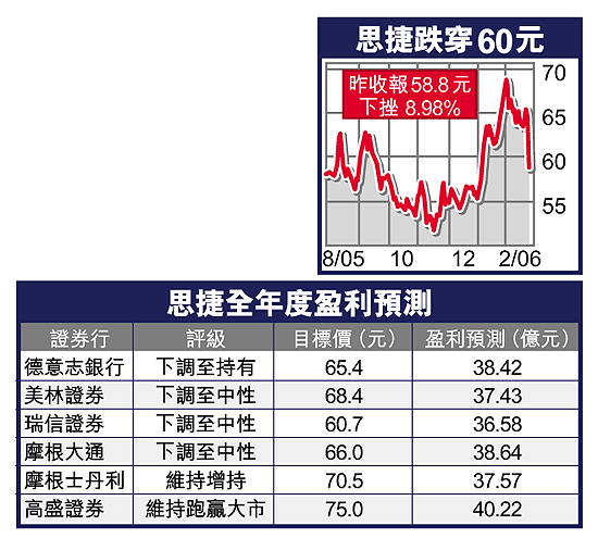 【本報訊】一向公布業績後急升的思捷環球(330),昨日遭遇拋售,主要是多家證券行調低其評級,令其一開市已跌破60元,最低曾見58.4元,收報58.8元,下挫5.8元或8.98%,是自04年5月以來最大單日跌幅。
