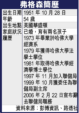 周三宣布辭職的聯儲局副主席弗格森現年54歲,他在1997年獲當時的美國總統克林頓延攬進聯儲局,1999年擢升為副主席,布殊在2000年上台後繼續任用他。弗格森任期原本到明年10月才屆滿。