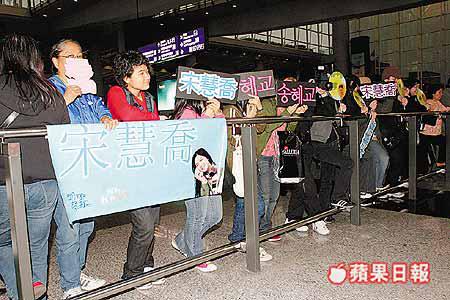 戴上冷帽、身穿T恤的宋慧喬及架上墨鏡、穿啡色外套,並戴上白色耳塞的車太鉉在六時半左右步出抵港大堂,現場影迷即時𠲖嘩鬼叫,並一窩蜂地衝上前,宋慧喬不時撫摸自己的臉龐及捽眼,動作多多。宋慧喬對fans很友善,頻頻展露甜美笑容,更主動揮手打招呼,令fans禁不住大叫:「你好靚。」