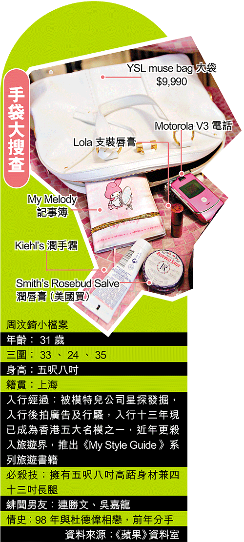 除了近期與黎明拍拖的樂基兒,過去三年見報冠軍的香港模特兒,非周汶錡莫屬。講好,周汶錡是首個成立模迷會的名模,出結婚書、旅行書。講壞,傳整容、隆胸,登上雜誌封面,名列被富商照顧女星模特兒名單,加上甩拖的杜德偉、台灣的連勝文,和時刻計算準確的性感尺度,周汶錡的確話題最多,最難得是任何時候都笑容可掬、百毒不侵。