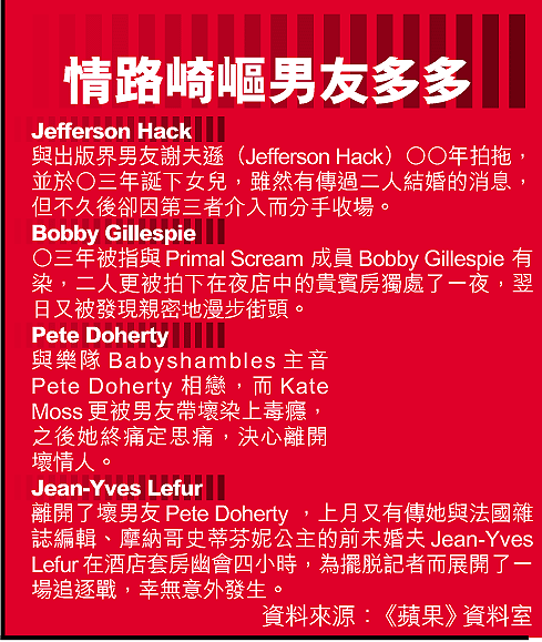 英國日前有報道指姬蒂摩絲(KateMoss)與祖迪羅(JudeLaw)的前妻迪霍絲(SadieForst),於上周三齊齊到夜店狂歡,據目擊者表示,當晚姬蒂與一名貌似TheStrokes的結他手AlbertHammondJr的男子,於夜店中親熱及接吻,兩人無視他人目光,表現親暱。