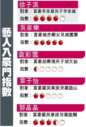 娛樂圈近年締造不少童話式的愛情故事,雖然不擔保有完美結局,但藝人們總是勇往直前,朝着入豪門這目標進發。近年圈中藝人與社交界公子名媛都有過不少對對碰,章子怡和跳水公主郭晶晶分別與霍震霆兩位公子霍啟山和霍啟剛撻着;袁彩雲剛被傳媒踢爆與合和集團主席兼全國政協委員胡應湘之子胡文新拍拖,可惜情人節前女方證實戀情無疾而終,有指胡應湘棒打鴛鴦,令袁彩雲入豪門夢碎。