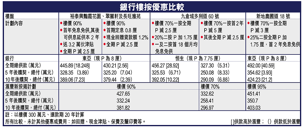 繼滙豐銀行前周燃起按揭戰火,各銀行紛紛配合發展商賣樓步伐,上周東亞銀行及恒生銀行,分別為裕泰興、會德豐地產(049)及新鴻基地產(016)部份貨尾盤,推出多款按揭計劃。若與滙豐的計劃比較,發覺對供樓逾10年才考慮換樓的用家來說,幾乎全無着數,其中新地土瓜灣農圃道18號的按揭計劃,對買樓自住的用家而言,可謂最搵笨。