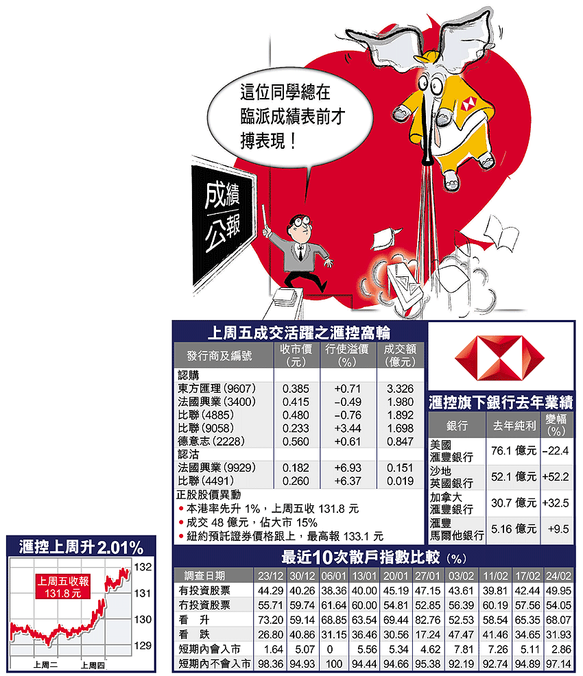 【本報訊】上周五英國萊斯銀行因半年業績優於市場預期,股價在倫敦升4.71%,同時帶動其他銀行股在美國市繼續全面攀升,其中滙控及渣打(2888)紐約收市價,分別較上周五本港收市上升0.65%及0.14%,收報132.655元及199.781元,其中滙控再創1年新高,在美市升幅相當於恒指30點。