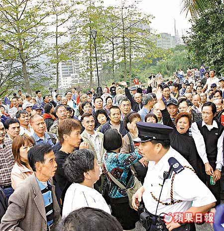 雙方經過半小時拉鋸,群情開始洶湧,職員恐場面失控,致電報警,一對男女軍裝警員到場,卻受到圍觀者指摘,警員保持克制,百多人圍着警員呼呼喝喝,甚至有人講粗口,康文署職員立即召來多名保安員,組成人鏈,圍着兩名警員,護送他們離開,沿途仍被百多人邊追邊罵。
