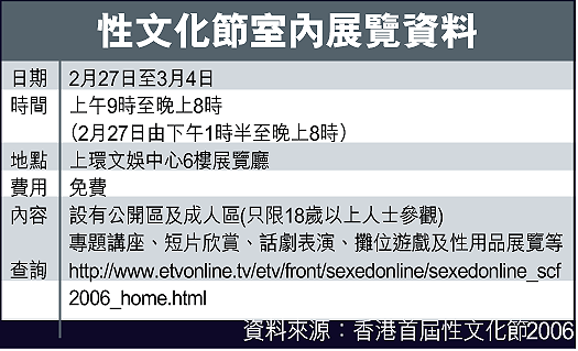 此外,由今日起會在上環文娛中心六樓展覽館連續六天舉行「性文化節室內展覽」,屆時會分公開區及成人區,成人區只限十八歲以上人士進場,展出不同的性用品及圖片。