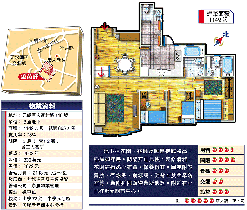 元朗采茵軒是唐人新村一帶樓齡較新的低密度屋苑,共建8座,提供104個單位,面積由719至1415方呎,各座地下單位連私家花園,合共25伙,部份以高低層設計,如今次介紹的單位,客廳及3房樓底高逾10呎,外連花園,有置身洋房大屋感覺。