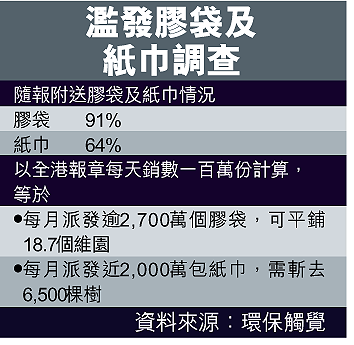 環保觸覺過去三個月調查全港一百四十五間報紙零售商,觀察逾四百三十五次消費者購買報紙的行為,結果發現九成一及六成四顧客分別獲贈膠袋及紙巾。若以全港報紙每天總銷量一百萬份計,報紙零售商每天派發九十一萬個膠袋及六十四萬包紙巾,一個月便等於二千七百多萬個膠袋及近二千萬包紙巾,數量驚人。