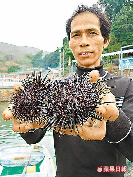 在西貢糧船灣試辦全港首個海膽養殖場的陳德興說,海膽貨源主要是附近白腊灣及浪茄灣,撈獲後放入糧船灣養殖待售,估計灣內目前約有二萬隻海膽。