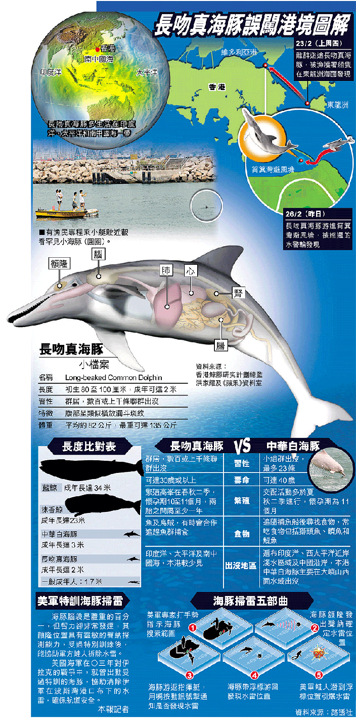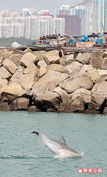 【本報訊】筲箕灣避風塘昨日搖身一變,竟變成了「海洋公園」?一條本港罕見的長吻真海豚(Long-beakedCommonDolphin)懷疑離群迷途,竟輾轉游進了避風塘的死胡同,尋不到出路游回大海,但小海豚顯然不害怕周圍漁船,反而悠然自得的在水中暢泳,更不時跳出水面翻騰,儼如海洋公園的海豚表演一樣,吸引了不少市民到來圍觀歡呼。 記者:胡恩宏、劉漢權