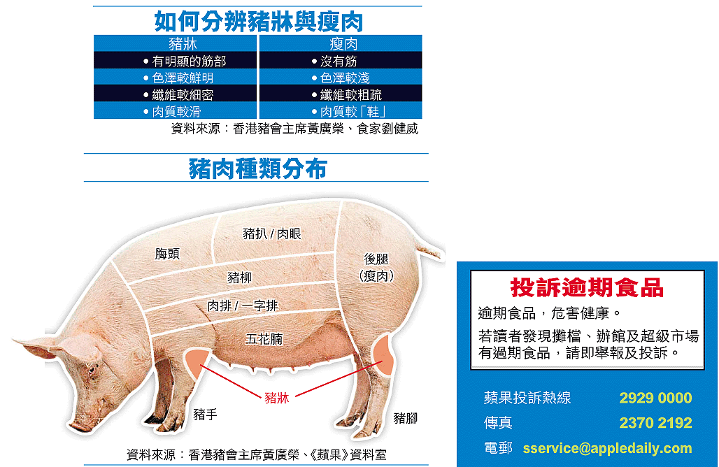 有熟悉超市新鮮食品部運作的人士指出,一隻豬只得約五斤豬𦟌,瘦肉則有約三十斤,若超市將瘦肉冒充豬𦟌出售,「咁做法一隻豬可賺多幾百蚊,兩大超市每日賣成千隻豬,計計埋埋每個月賺多成二十萬。」記者連日來到多間超市觀察,發現豬𦟌供應源源不絕,瘦肉卻往往只剩下少許,甚至一早沽清,「貨源」與豬𦟌瘦肉的比例明顯相反。