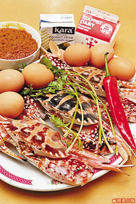 3隻海紅蟹、6隻雞蛋、1隻大紅辣椒、1包咖喱醬、1盒椰漿、1盒牛奶、適量芫荽、薑、蒜頭、鹽、豉油及生粉