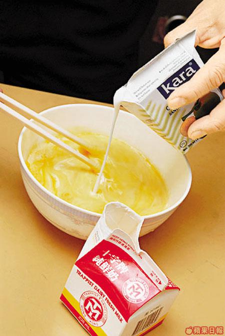 1.除殼洗淨海紅蟹,將雞蛋、牛奶同椰漿搞拌成漿。