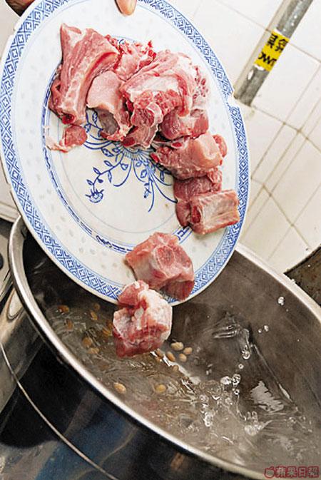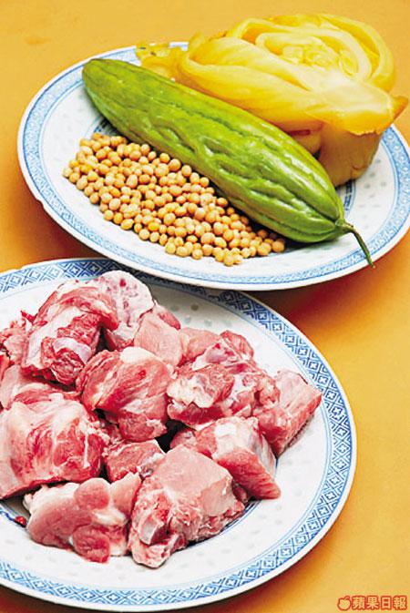 1斤排骨、2個苦瓜、10両鹹菜、2両白豆、適量鹽、糖及冰糖