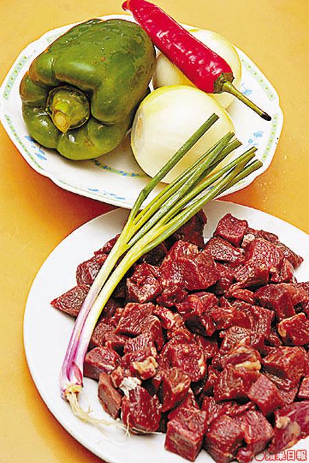 1斤牛柳、1個青椒、1隻紅椒、2個洋葱、1棵青葱、適量胡椒粉、鹽、生抽
