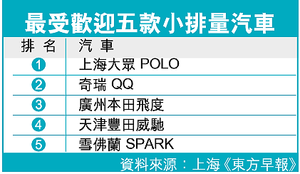 由於當局近年提倡建設節能型社會,市場普遍預期小排量汽車會成為大熱之選。調查顯示,七成九人會考慮買小排量(即油缸容量小於一千四百CC)汽車,主要因為耗油量小、物美價廉以及養車成本低。在十款汽車中,得票率最高的是上海大眾POLO和奇瑞QQ(見表)。