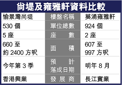 【本報訊】乘近期連串利好消息刺激,發展商伺機開賣新盤。繼泛海國際(129)開賣今年頭炮新盤油塘鯉灣天下後,長實(001)及香港興業(480)也蓄勢待發。長實的葵涌雍雅軒準備本周首輪內購之際,香港興業的愉景灣尚堤,獲投資客斥6500萬元大手洽購10伙,發展商計劃下周開售前落實有關成交。