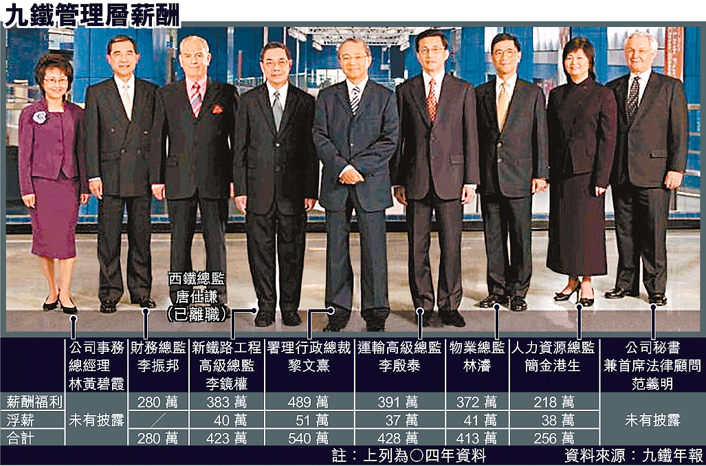 九鐵○四年起實行高層浮薪制,將高層員工兩成薪酬扣起轉為浮薪,按表現決定分發數額。該年年報顯示,九鐵向管理層發放的浮動薪金總額逾二百萬元,其中以黎文熹分得的花紅最多,達五十一萬元,最少的一人也有三十七萬元,相當於各人薪金一成至一成七。董事局決定發花紅後,由行政總裁決定每人金額,行政總裁則自行決定自己金額。以黎文熹年薪近五百萬計,若他決定取足兩成浮薪作花紅,金額已近一百萬。