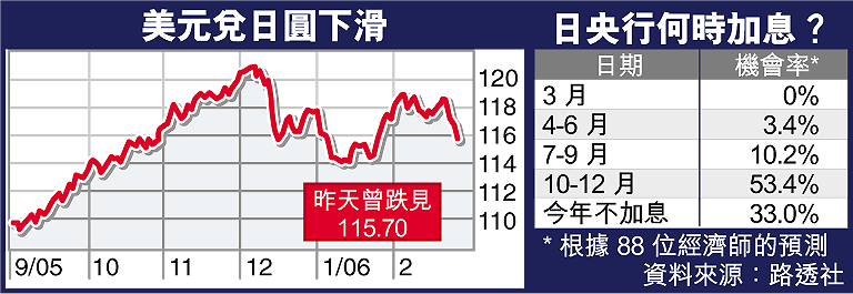 日本政府高層過去兩天對央行收緊銀根的立場出現重大轉變,金融市場幾乎一致相信央行會在4月底前解除實施5年多的超寬鬆貨幣政策,刺激日圓兌每美元昨天攀上115,創1個月新高。