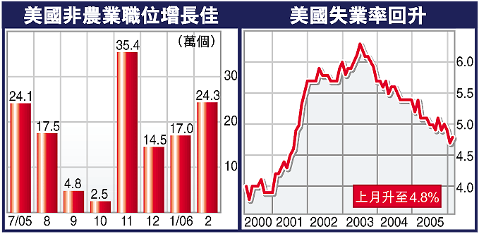 失業率則由1月的4.7%(4年半低位),微升到2月的4.8%,高過預期的4.7%。但分析員說,失業率上升是由於更多人投入勞工市場尋找職位,數據反映就業市道仍有助美國經濟擴張,預料聯儲局未來數周需要進一步加息。