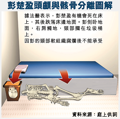【本報訊】前政務司司長陳方安生胞兄方曼生名下物業發現模特兒彭楚盈骸骨,頭顱與身體骸骨分開一直是焦點所在,死因庭昨日傳召法醫出庭作證,指有可能是屍體自然腐化後所致,科學鑑證主任亦指出現場沒有血迹,亦沒有打鬥過的痕迹。 記者:戴國輝