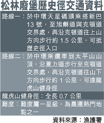 【本報訊】十八天的香港保衞戰,終難抵禦日軍的轟炸令香港淪陷三年零八個月。位於港島西龍虎山的松林廢堡數十年來一直保存着炮台被炸後那一刻的原貌,在香港近代史上別具歷史價值。今天,炮台雖已廢置,但炮床、指揮台及多座掩蔽體依然清晰可辨,漁農自然護理署在龍虎山健身徑上添置多塊展板,闢作全長四百米的松林廢堡歷史徑,重述炮台的歷史。
