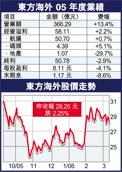 受到高油價拖累,集裝箱航運業03及04年的景氣周期結束。東方海外(316)截至去年12月底止純利下跌2.9%,至50.78億元。末期息減少8.6%,每股派1.17元。今年料仍受高油價及低運費困擾,東方海外管理層對今年前景不表樂觀。