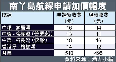 【本報訊】經營南丫島渡輪的港九小輪公司將在短期內申請加價,平日每程加兩元,假日的票價則維持不變,南丫島居民對加幅表示震驚,港九小輪又表示,為吸引更多乘客,減輕加價壓力,正積極開發南丫島景點,包括轉運風車及許願榕樹等。