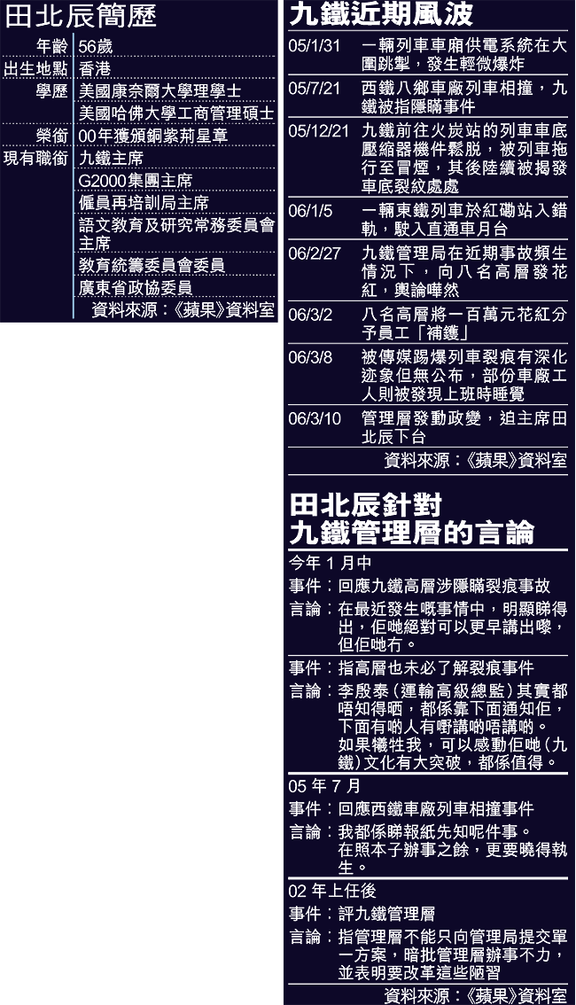 至於「兵變」的導火線是九鐵被踢爆隱瞞東鐵裂痕事件後,田北辰被指在員工筋疲力竭補鑊的情況下,只顧「捉住」幾名管理層向公眾認錯,令不少員工不滿,士氣甚差。至昨日上午,署理行政總裁黎文熹首先發難,去信管理局陳述公司管治出了問題,「管理」應是管理人員的職責,主席的職責是「管治」,但九鐵面臨的是管治與管理不分,權責不清。
