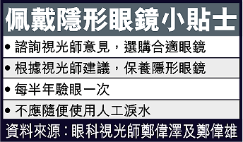 【本報訊】一項調查發現,超過八成隱形眼鏡使用者曾因為雙眼乾涸和疲倦而影響工作效率和社交生活。有視光師指出,雙眼持續性乾涸可能影響日常生活,建議選購隱形眼鏡前應先接受詳細驗配檢查,而雙眼容易乾涸的人士應選用具保濕成份的產品。
