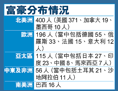 全球七百九十三名億萬富豪中,美國佔了近一半,達三百七十一位,他們的總財富是一萬一千億美元(八萬五千八百億港元)。歐洲共有一百九十六名富翁上榜,總財富是八千零二十億美元(六萬二千五百五十六億港元),當中以德國富翁最多,有五十五人。超級富豪最愛住的城市,首推紐約,其次是莫斯科和倫敦。