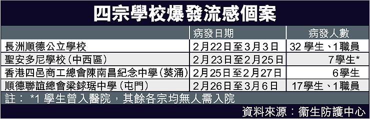 據衞生防護中心監察普通科門診及私家診所流感數據,由上月底起本港流感病發率逐步上升,在三月四日前的一周,私家診所每一千人有五十八點二宗流感個案,普通科門診則有六點八宗。另外,由二月底至本月初,有四間學校出現學生集體感染流感,其中長洲順德公立學校有三十二名學生及一名職員患病。