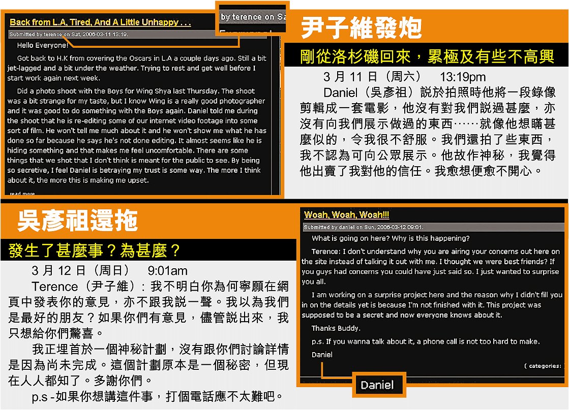 自Alive於中環吵大鑊後,四人互不瞅睬,當中以尹子維反應最激,上周六先在Alive官方網上撩交嗌,以英語寸吳彥祖隱暪事情、出賣了自己對他的信任,令他很不舒服。翌日,吳彥祖見對方留言馬上反擊,同樣以英語窒尹子維,指自己正在進行令Alive驚喜的神秘事,現在搞到人人都知,倒真多謝他。