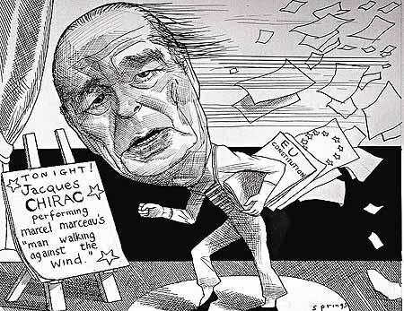 展品包括不少政治漫畫,這幅講述法國總統希拉克模仿法國默劇大師馬塞.馬素(MarcelMarceau),上演與風對抗戲碼,影射催生歐盟憲法困難重重。