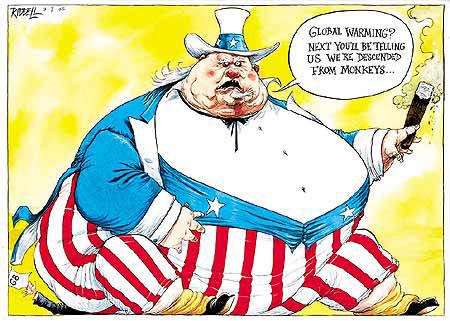 獲獎插圖畫家ChrisRiddell去年為《TheObserver》繪畫的FatUncleSam漫畫,嘲諷美國為私利而拒絕在污染及全球暖化問題上與其他國家合作。