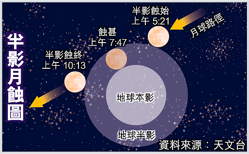 將於明日出現的半影月蝕,即月亮只會進入地球的半影,而不會進入本影,所以從肉眼上觀看,月亮的光度只會略為轉暗。